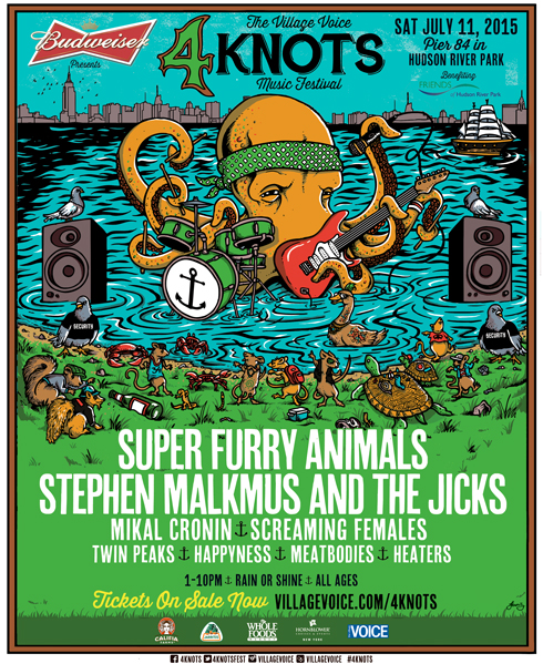 New York, NY - June 10, 2015 - The Village Voice is proud to announce Stephen Malkmus and the Jicks to co-headline the fifth annual4Knots Music Festival, alongside previously announced headliner Super Furry Animals (first NYC performance in 6 years). Screaming Females have also been added to this year's lineup. 4Knots is being held on July 11, 2015 at Pier 84 in Hudson River Park from 1PM - 10PM, featuring previously announced lineup of Mikal Cronin, Twin Peaks, Happyness, Meatbodies, and Heaters.