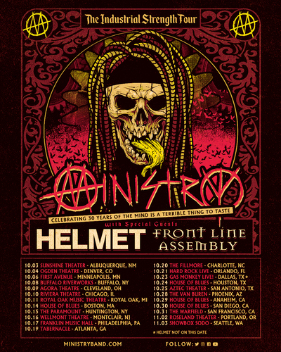 The tour’s special guests Front Line Assembly remain on the lineup for this one-of-a-kind celebration alongside newly announced support act Helmet. This special tour honors not only the 40th anniversary of Ministry in 2021 but also the 30th anniversary of revolutionary album The Mind Is A Terrible Thing To Taste and will also include brand-new material from Ministry’s upcoming 15th studio album. Due to the uncertainty of COVID-19 protocols for visas, travel and vaccine distribution in Germany as well as immigration uncertainty, KMFDM will regrettably not be taking part in this tour.