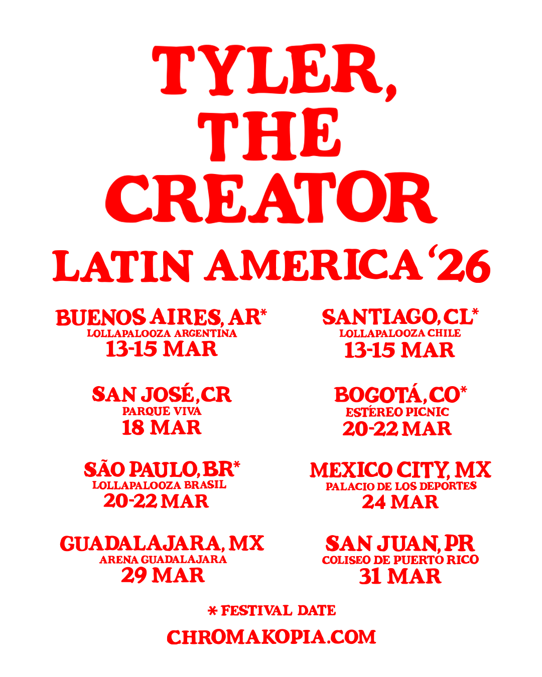 (September 12, 2025) - In the midst of the Asian leg of his CHROMAKOPIA: THE WORLD TOUR, Tyler, The Creator announces new live dates in Latin America, launching in March of 2026. Starting March 13th, he’ll take his critically acclaimed live performance to Mexico City, San José, Guadalajara, and San Juan, as well as to Estéreo Picnic in Bogotá and Lollapalooza festivals in Buenos Aires, Santiago, and São Paulo.