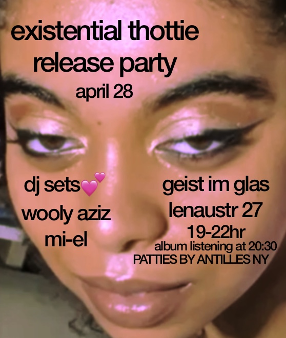 To celebrate the release, duendita will host an existential thottie listening event in Berlin on April 28, featuring DJ sets from wooly aziz and mi-el, Caribbean patties by antilles NY and an album playback at 10:30pm along with a short performance.