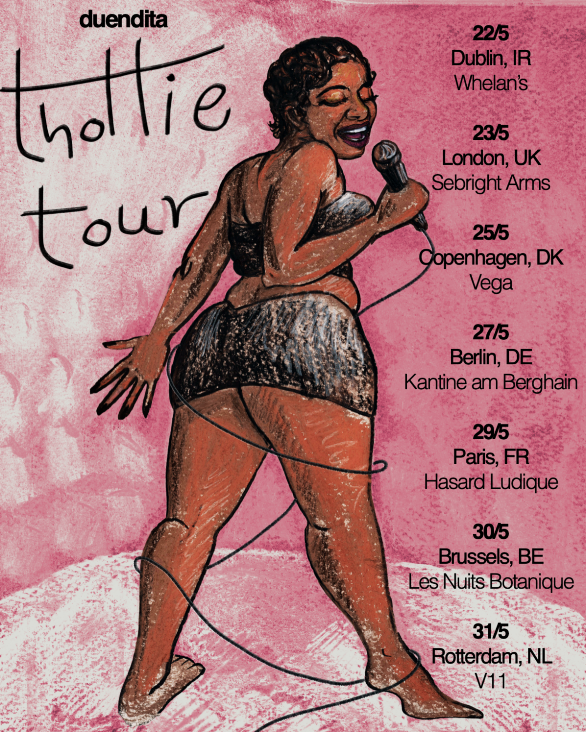 Beginning in May, duendita will bring the new music on the road with the thottie tour, performing songs from the upcoming album in cities across Europe. Tickets are on sale now and available for purchase here.